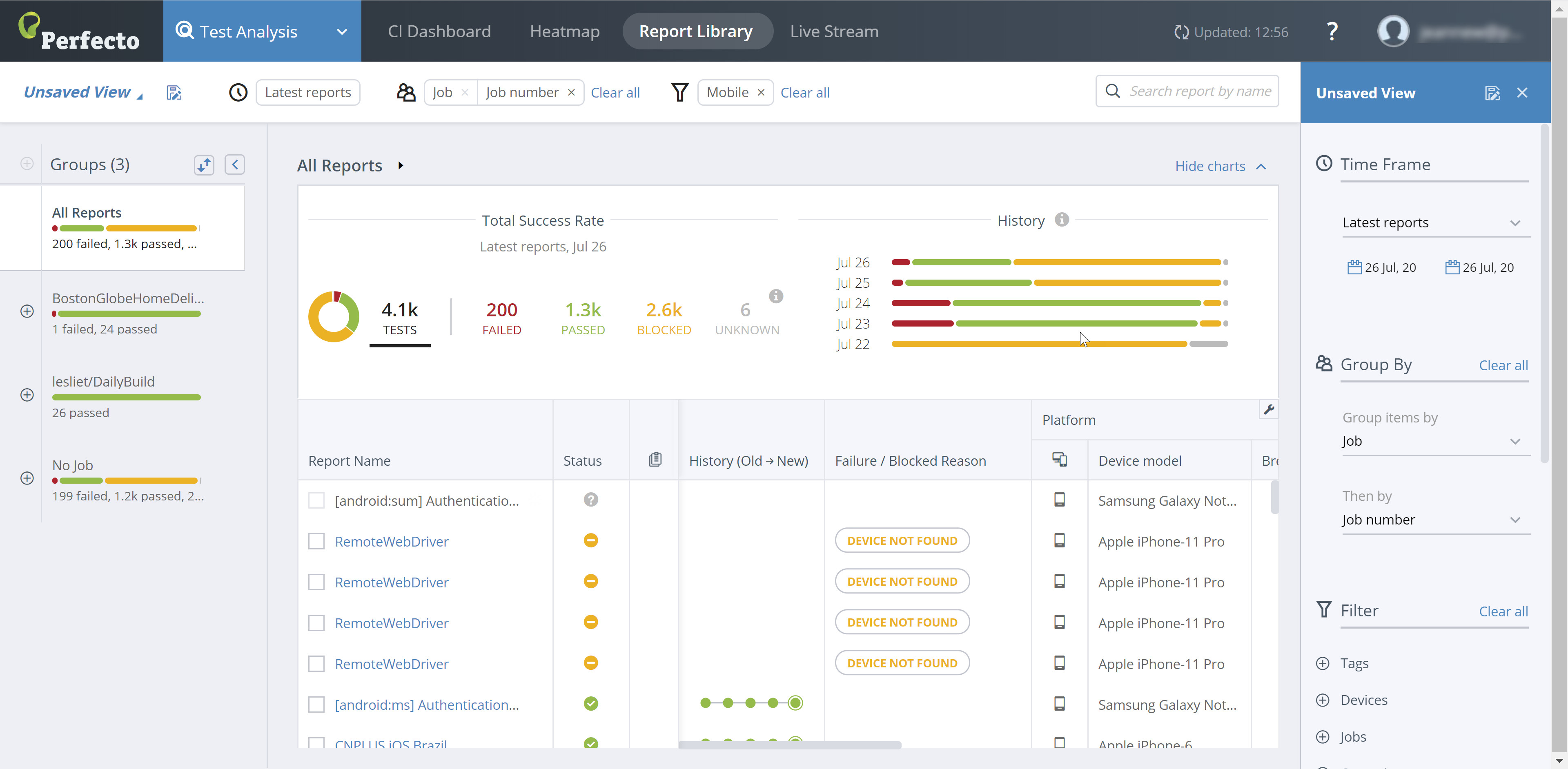 To view tests grouped by continuous integration system job and build, you need to provide the job name and build number into reporting as system variables. This enables you to group your test executions in reporting first by job name and then by build number, providing you a complete overview of the build quality.