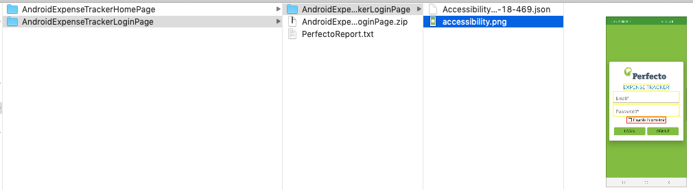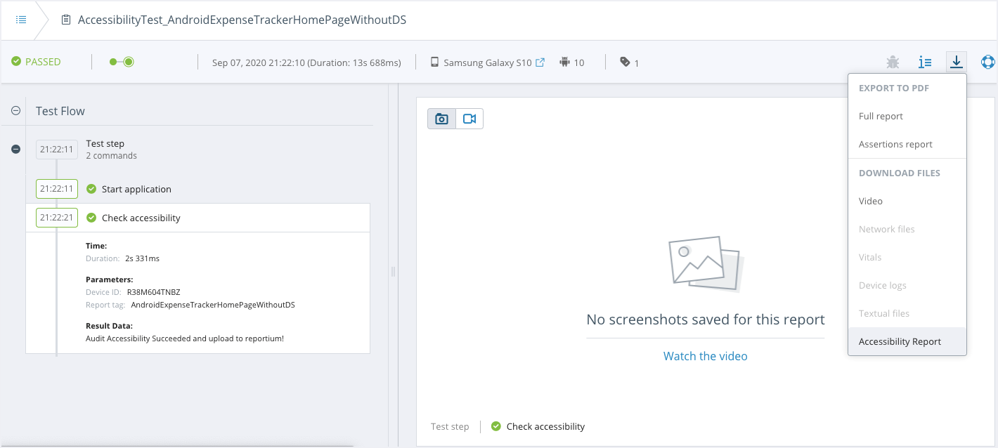 PerfectoReport.txtfile, which includes a link to the Single Test Report in the Perfecto UI, where you can also download the accessiblity report
