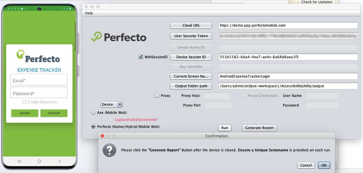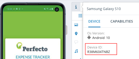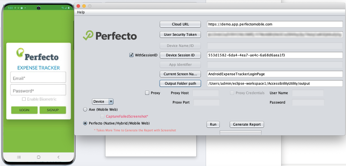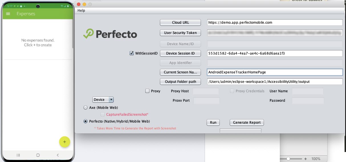 Using the Java utility without session sharing (that is with the WithSessionID checkbox cleared) is not recommended.To perform a manual accessibility test without session sharing, you need to provide the app identifier of the application under test, such as io.perfeto.expense.tracker. If you do not know the app identifier, you can find it in the legacy Perfecto UI, as shown in the following image. In the new Perfecto UI, this information will become available soon.