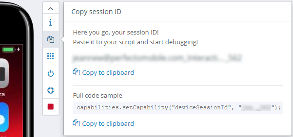 Device Session ID: The session ID as copied from the device in the Perfecto cloud. For more information, see Share a session with an IDE script.