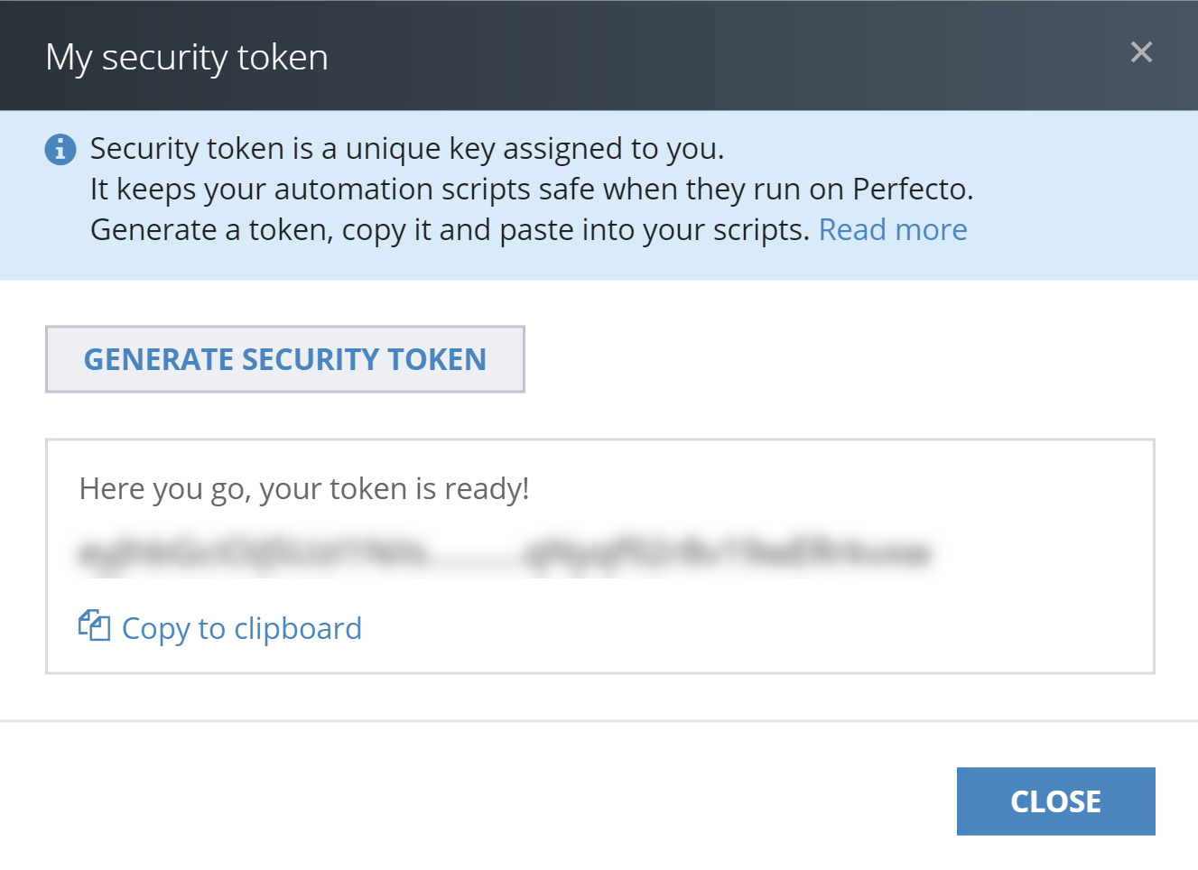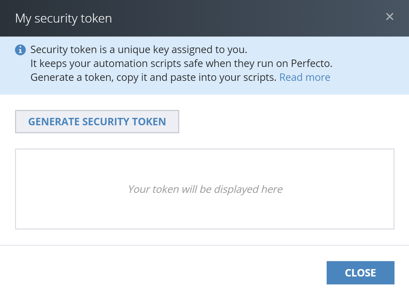 To generate a security tokenIn the Perfecto UI at <YourCloud>.app.perfectomobile.com (where YourCloud is your actual cloud name, such as mobilecloud), click your user name and select My security token.