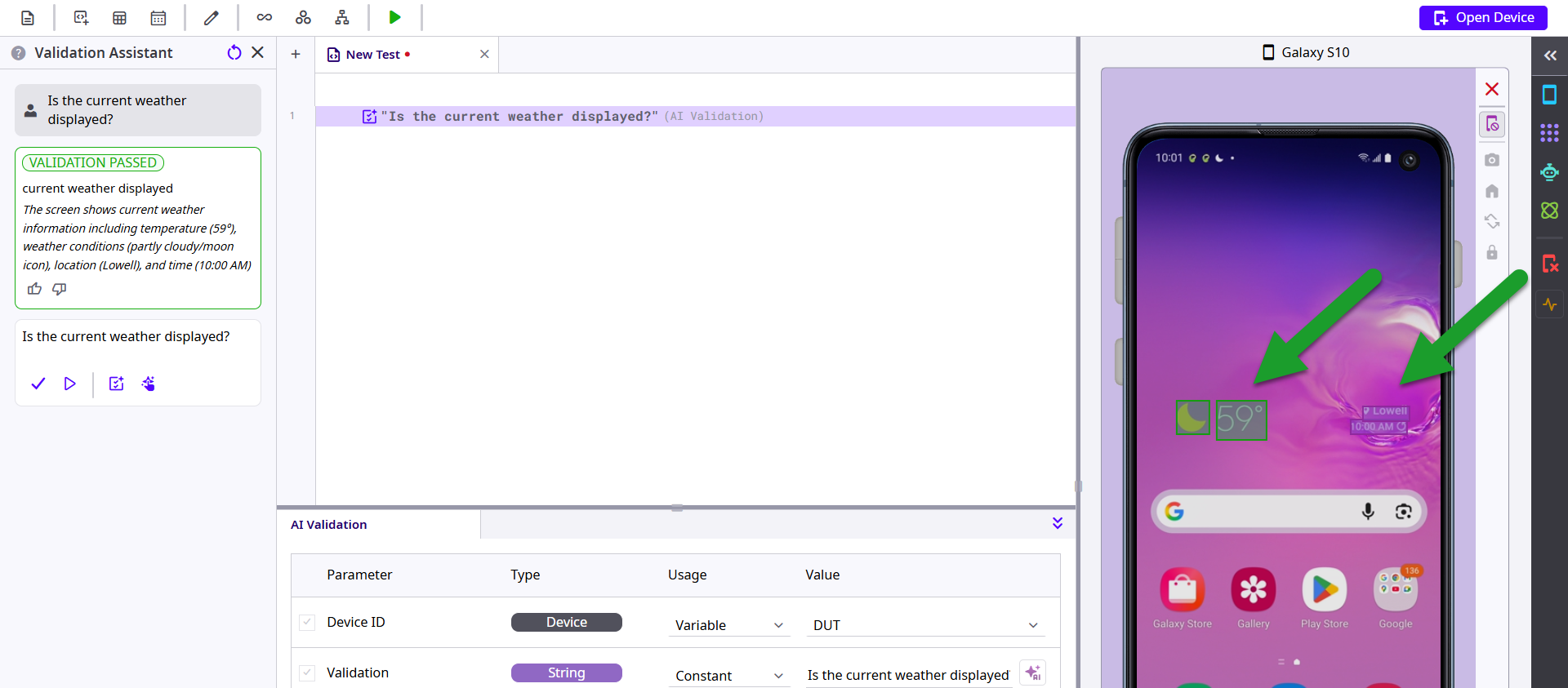 When you interactively create an AI Validation, the AI Assistant now highlights relevant UI elements on the device screen. To view a tooltip with more information, hover over a highlight. Highlight colors indicate validation status: