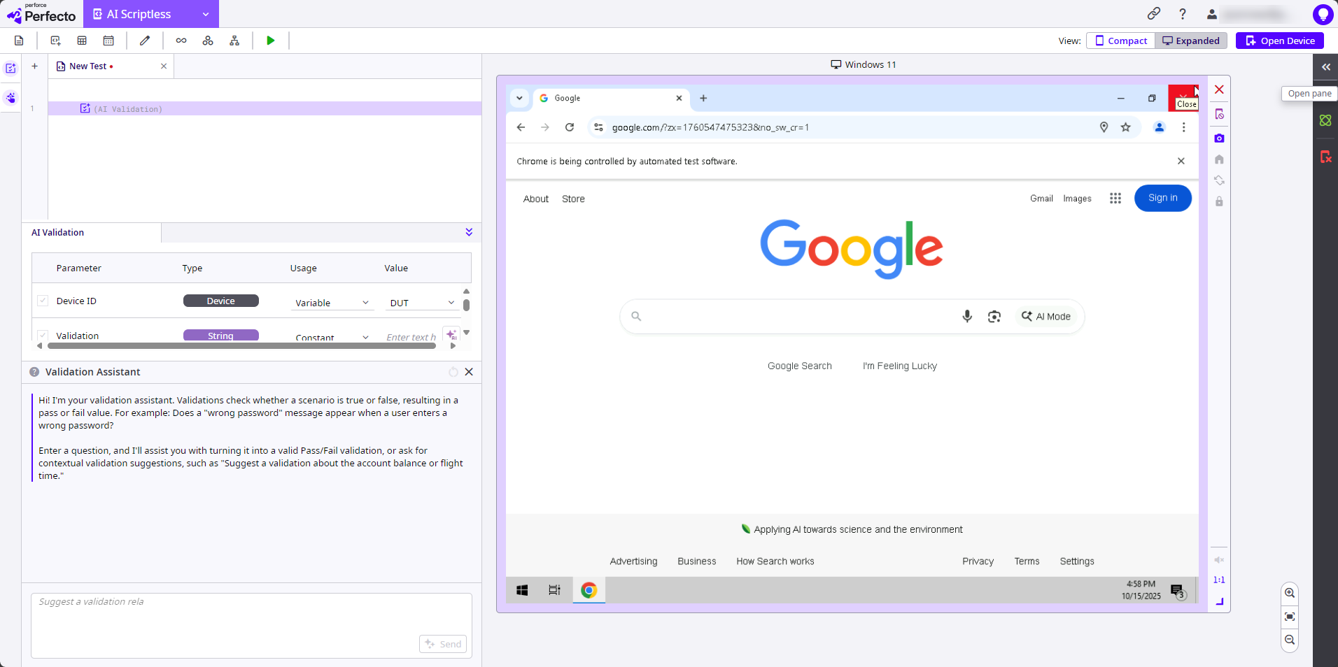 You can now create and run AI-driven tests on desktop web devices using the AI Scriptless interface. This interface supports efficient test creation with AI-powered commands across both mobile and desktop web environments.