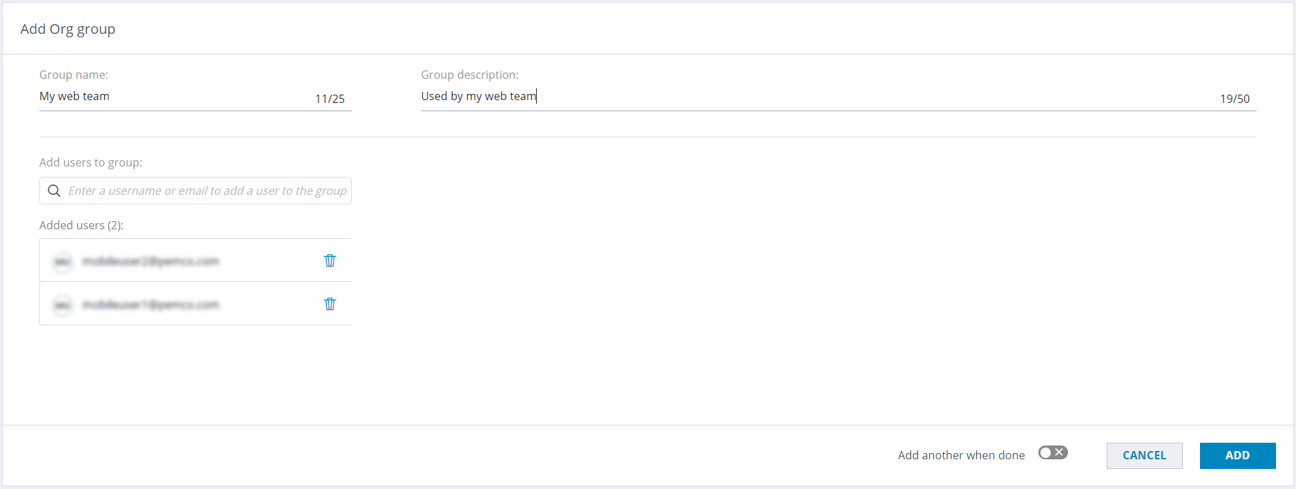 To add additional org groups, turn on the Add another when done option. You can also come back to adding users to a group later, whenever the need arises.