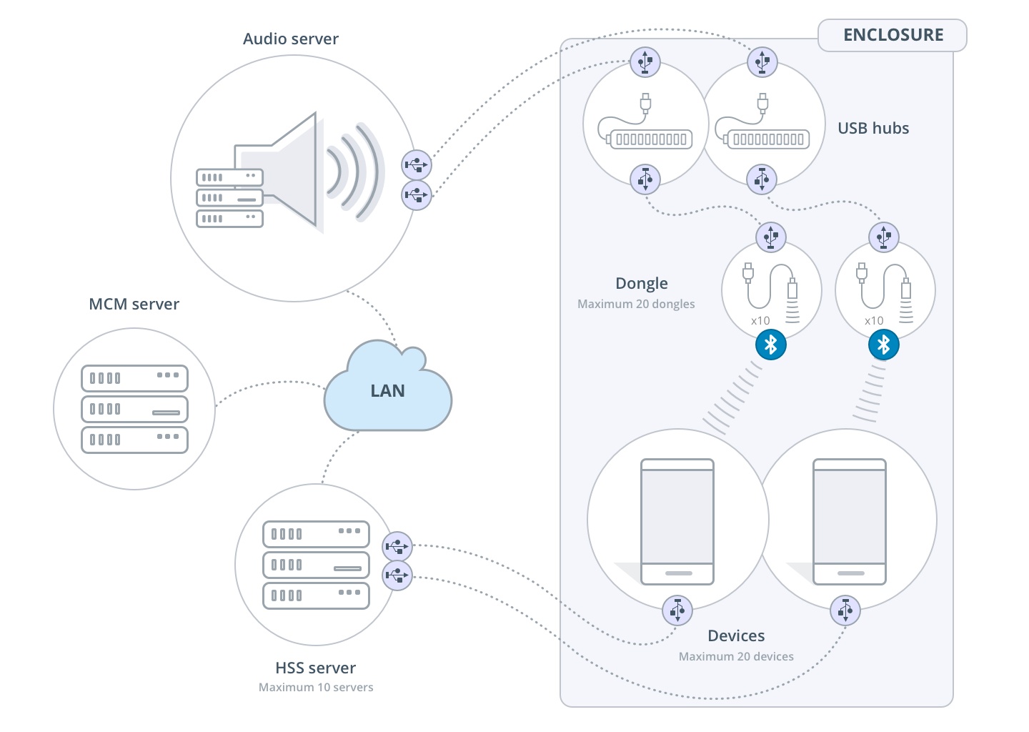 The audio server connects to mobile devices over BT using USB dongles. There is no limit on the number of devices a dongle can serve, but each dongle can only connect to a single device at any given time. As hardware, Perfecto uses a standard handset server (HSS) with two USB controllers. The maximum number of dongles per BT server is 10.